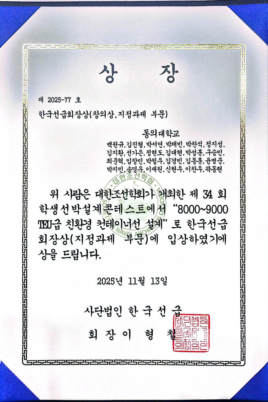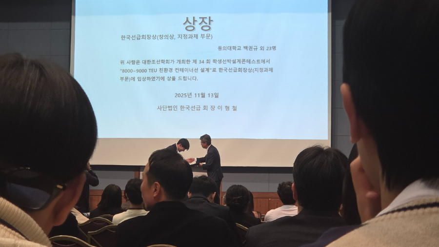 동의대학교 조선해양공학과 백권규 외 23명의 학생들이 2025년 대한조선학회가 주최한 "제34회 학생 선박설계 콘테스트"에서 한국선급 회장상을 수상했습니다.