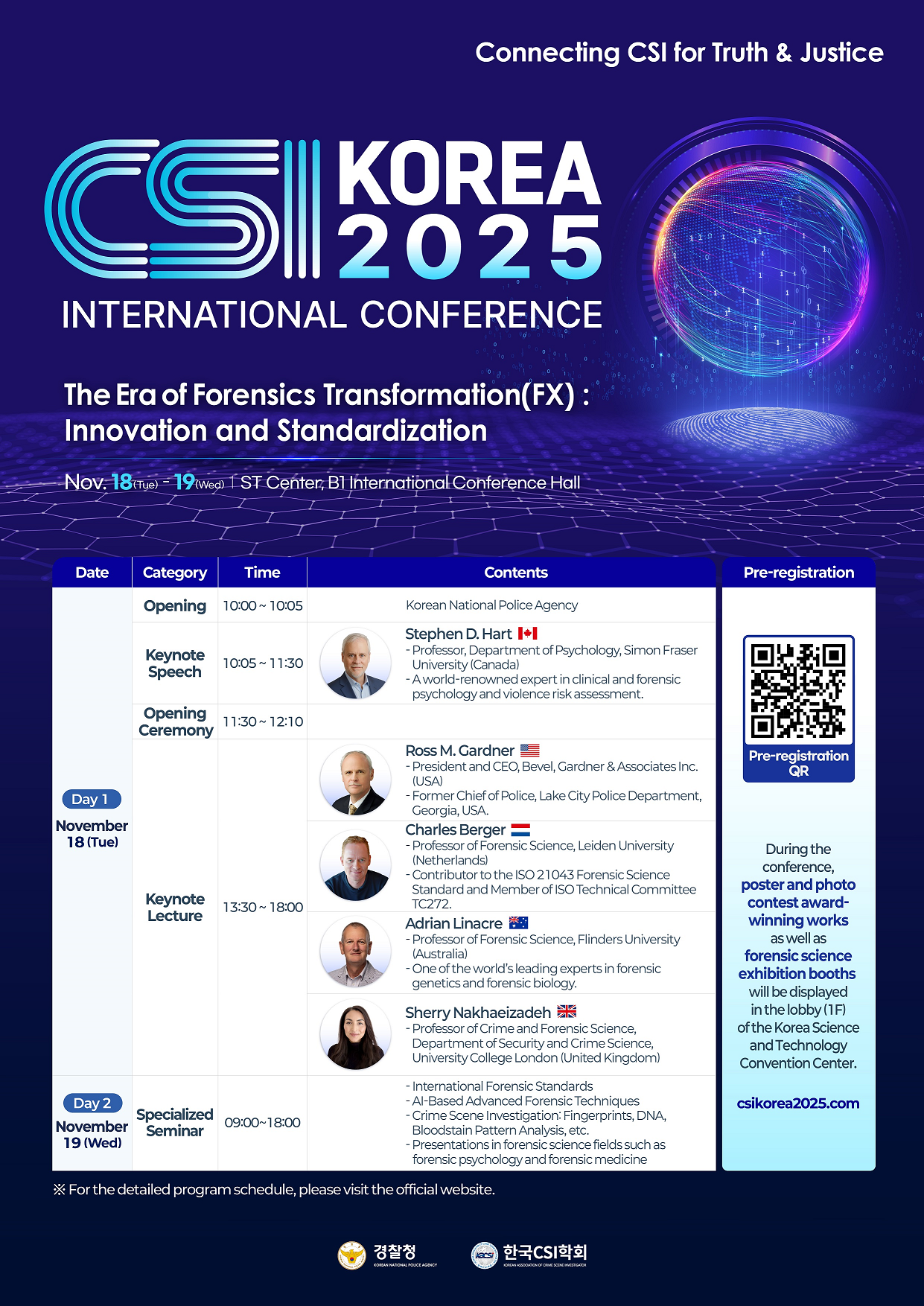 3. 위와 관련,「2025 제11회 국제 CSI 컨퍼런스」의 성공적인 행사 개최를 위해 과학수사에 관심 있는 분들에게 홍보 및 단체 참가 등록 관련 협조 바랍니다.